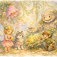 Lyndon and his friends built a “Glow Garden” right beside the Giant’s quiet spot. They placed glow shells in a circle. They sprinkled pearl sand like glitter. Star Collector set the jar in the middle.