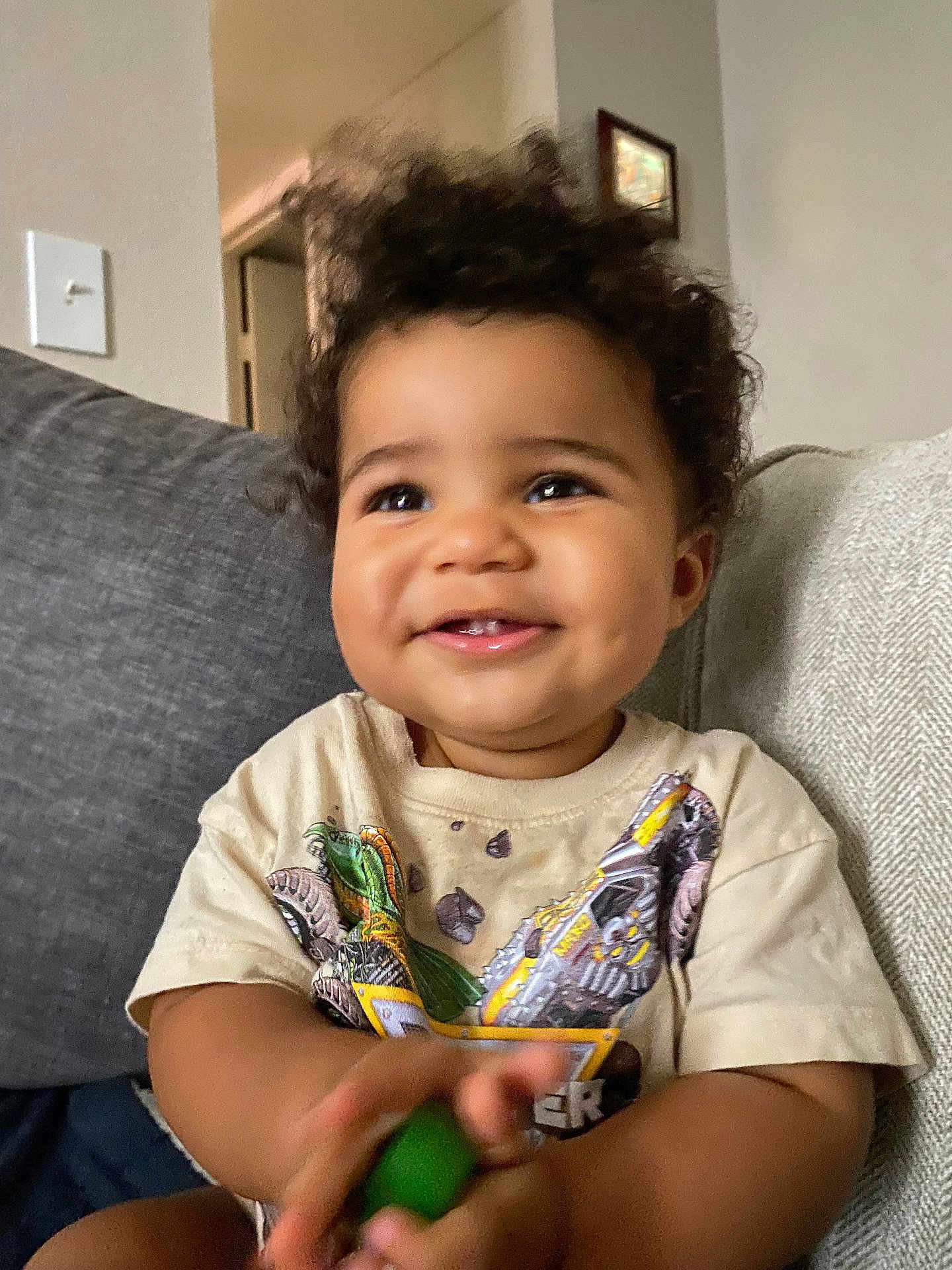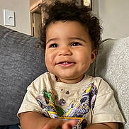 • Milton is registered to the contest to win money with this photo: toddler, child, smiling, curly_hair, indoor, couch, tshirt, dinosaur, toy, happy, person, young_child, portrait, seated, casual_clothing, living_room, cute, playful, baby, home